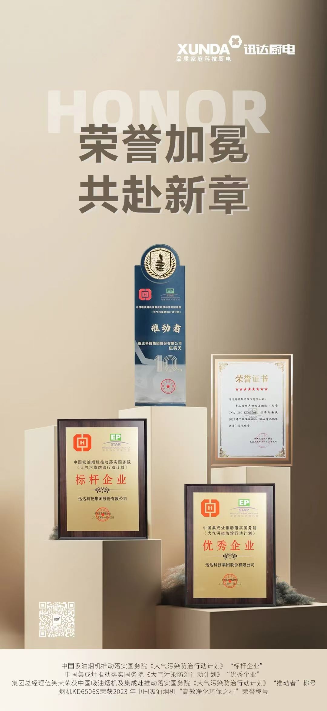 会上表彰了在高效节能、绿色环保领域做出表率的企业及产品,其中迅达集团荣获中国吸油烟机推动落实国务院《大气污染防治行动计划》“标杆企业”、中国集成灶推动落实国务院《大气污染防治行动计划》“优秀企业”两大殊荣,集团总经理伍笑天荣获中国吸油烟机及集成灶推动落实国务院《大气污染防治行动计划》“推动者”称号。迅达天圆套系跨界烟机CXW-360-KD6506S荣获2023 年中国吸油烟机“高效净化环保之星”荣誉称号。