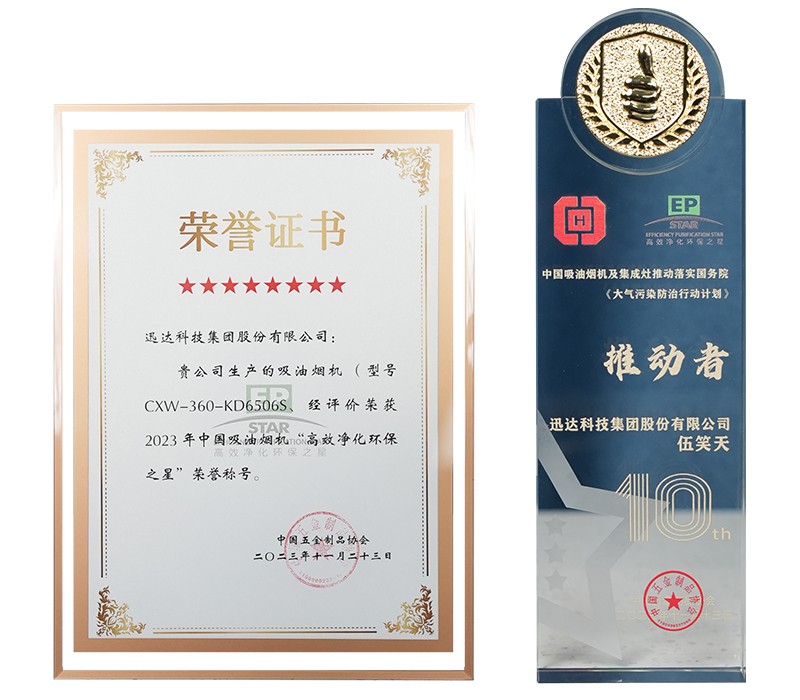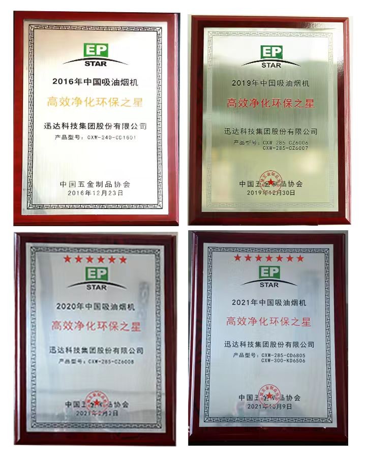 回望“高效净化环保之星”评选的十年间,迅达旗下平板烟机CD1601、侧吸式烟机CZ6006和CZ6007、天净系列烟机CZ6008、平板烟机CD6805与烟机KD6506分别获得了2016年、2019年、2020年、2021年“高效净化环保之星”称号。我们深知,绿色环保理念的笃行与延伸是品牌长青的基石。40年来,迅达集团不断推动技术创新,将绿色环保技术渗透进每一款产品中。